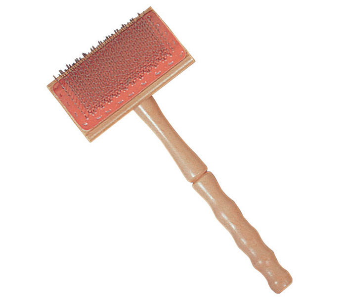 A flick carder is a small paddle or batten on a handle with small metal teeth. Rather than combing the staple you use a hitting motion with the flick carder. (A protected surface is a must with a flick carder!)