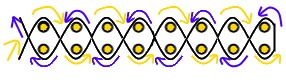 For the next and each following row, starting with the peg opposite the peg where the tail of the yarn is sitting, wind your yarn around each peg zig-zagging from one side of the loom as you did in the establishment row. When you have reached the end of the loom, turn and wrap the yarn around each of the pegs that you missed on the first pass.