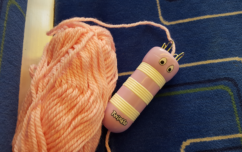 Of course, these days, you don't have to do it all by hand if you can source a french knitting machine. Here in Australia, you can buy them from Spotlight or you might see an advert for one on Facebook. With these gadgets, all you need to do is thread them correctly and then wind the handle. Winding the handle causes the needles (rather than pegs) to move up and down as the yarn winds around the top forming the stitches as it goes.