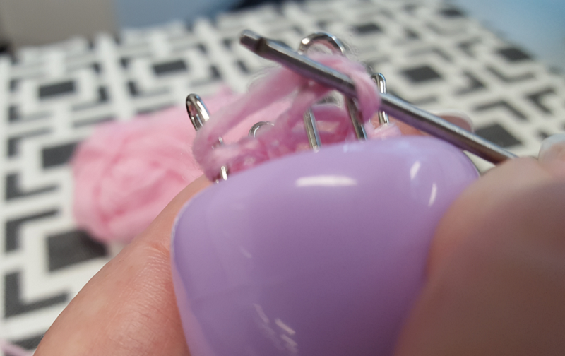 Use the tool to lift the stitch up and over the wool, lefting it fall to the back of the peg to form a new stitch. Give the tail at the bottom of the tool a gentle tug so that the new stitch sits neatly on the peg.