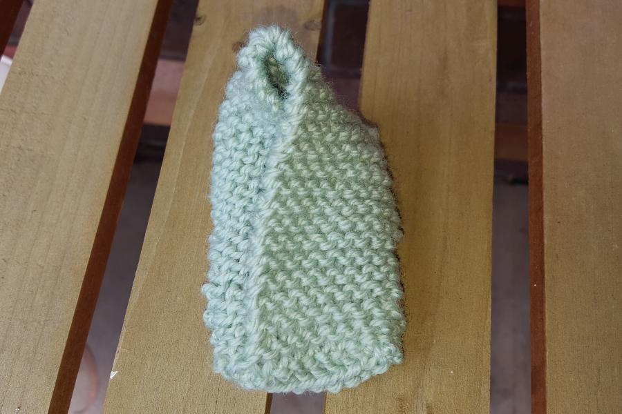 Piece 2: Cast on 10 sts using 4.00 mm needles and knit in garter stitch until the work measures 20 (23, 25) centimetres or long enough to go along one side, across the bottom edge and back along the second side of bootie base.