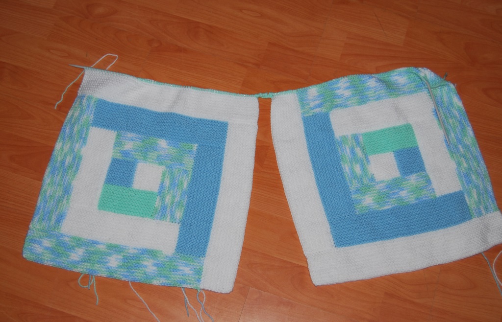 To join the first 2 blocks pick up and knit 70 sts along the bottom edge of the first block, cast on 10 sts, pick up and knit 70 sts along the right side of the other block.